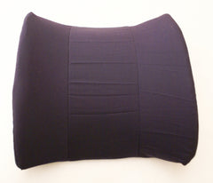 Anatomically contoured pillow to provide support for the lumbar area while sitting in a chair or driving in a car. Adjustable elastic strap helps secure pillow to back of chair.